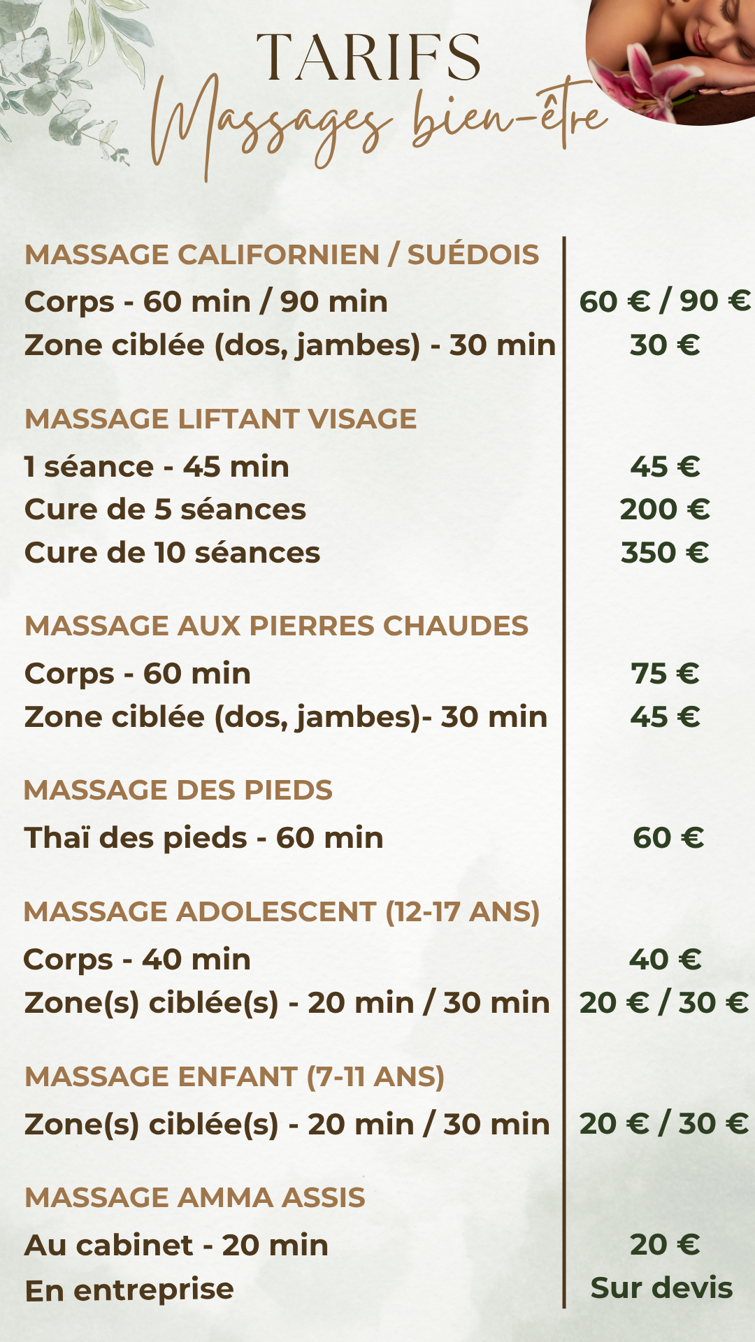 Je me limite à mon rôle de praticienne en massage bien-être et apporte uniquement des prestations de relaxation et de confort. Les prestations de massage bien-être n’ont aucune vocation thérapeutique et ne se substituent en aucun cas à un traitement médical.